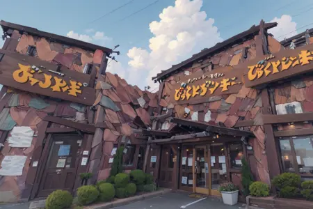 This is a LoRA that could possibly depict a landscape that looks like the exterior of one of the famous hamburger restaurants in Japan. これは日本で有名なハンバーグレストランのとある店舗の外観っぽい風景をもしかすると描くことができるかもしれないLoRAです。
