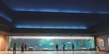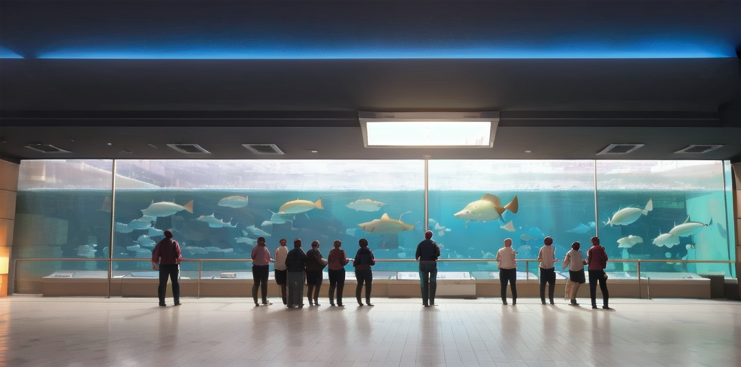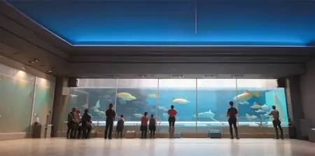 Prompt (indoors):sumasui, aquarium, 6+boys, multiple boys, multiple girls, walking, scenery, 6+girls, bag, crowd