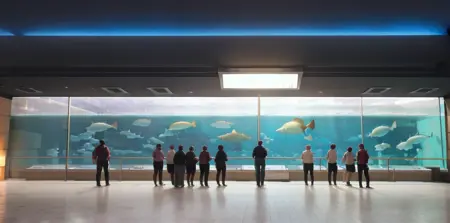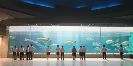 프롬프트(실내): sumasui, 수족관, 6명 이상의 소년, 여러 소년, 여러 소녀, 걷는 중, 풍경, 6명 이상의 소녀, 가방, 군중