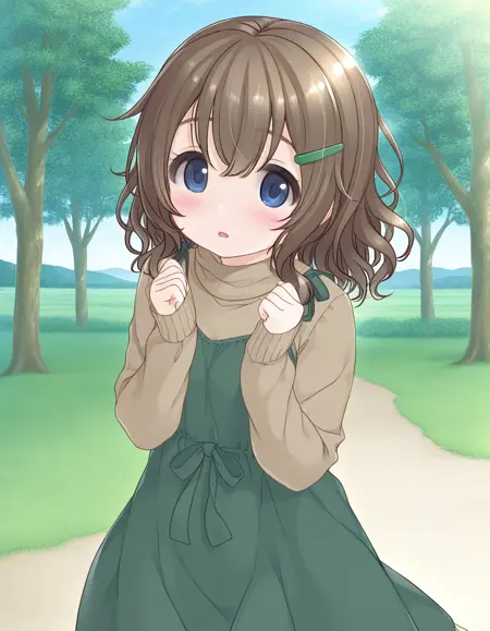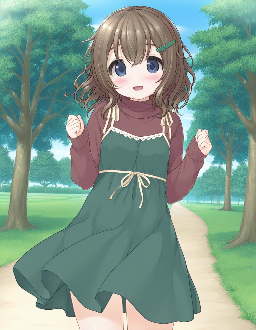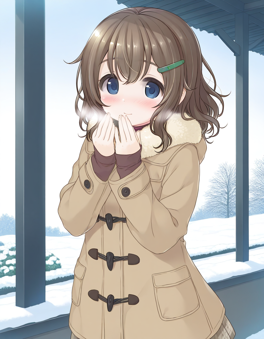 FukamiNonoka, 1girl, solo, bangs, medium hair, brown hair, hairclip, blue eyes,