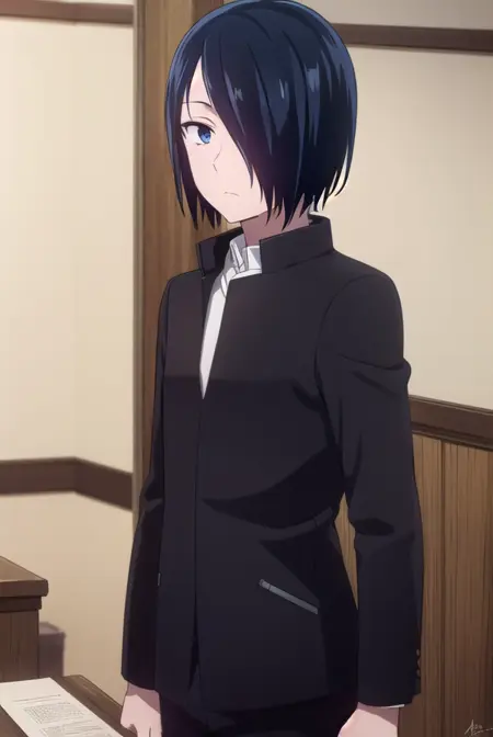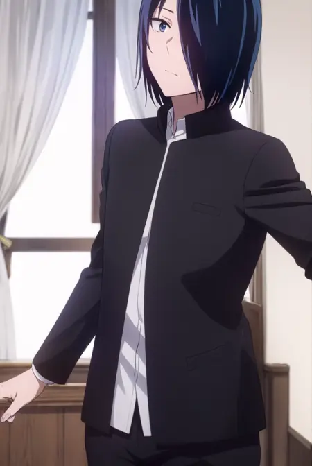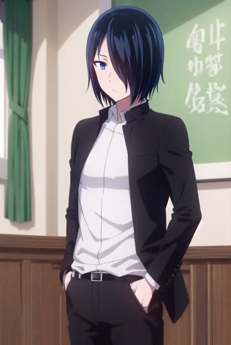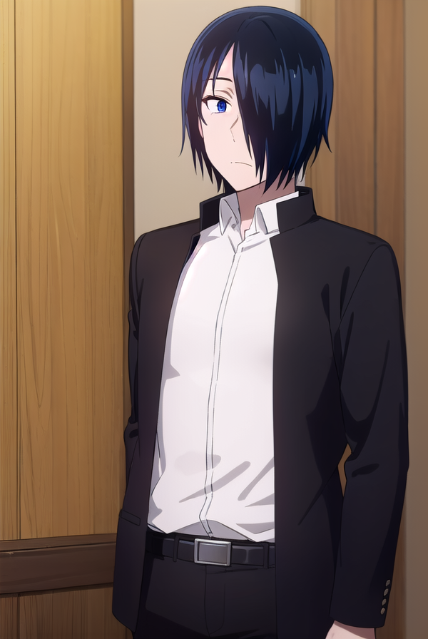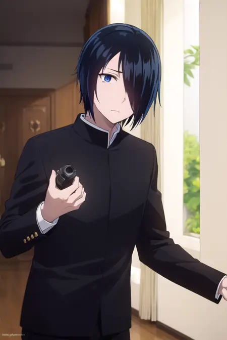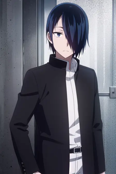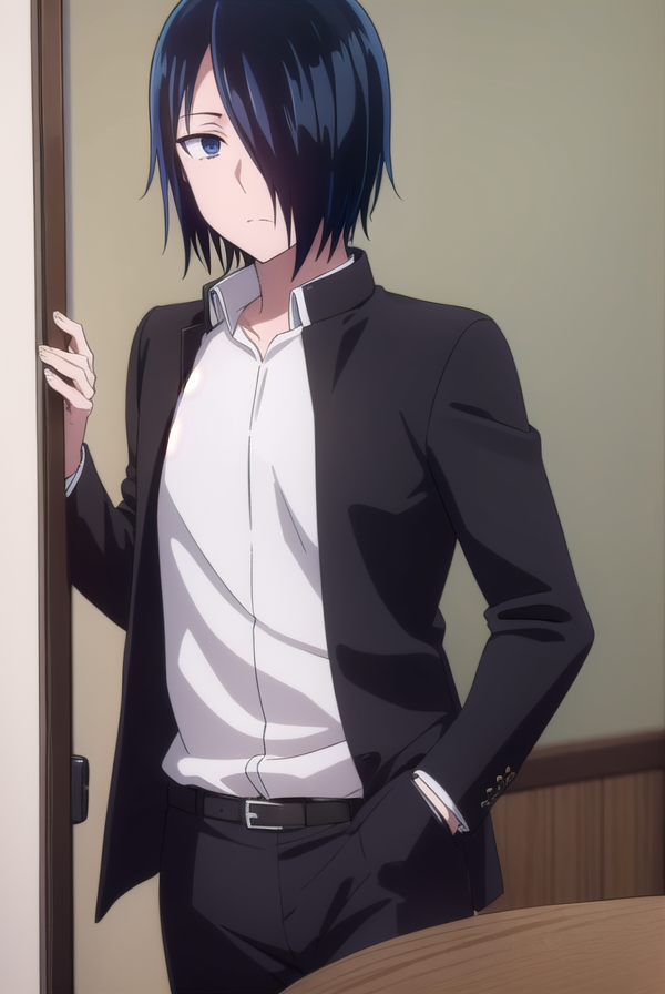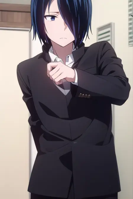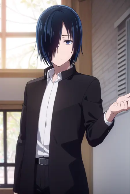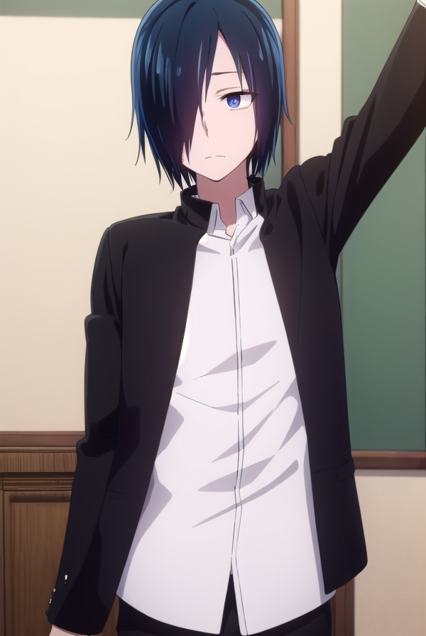 yuu ishigami, black hair, blue hair, male focus, (hair over one eye:1.5), (black eyes:1.3),