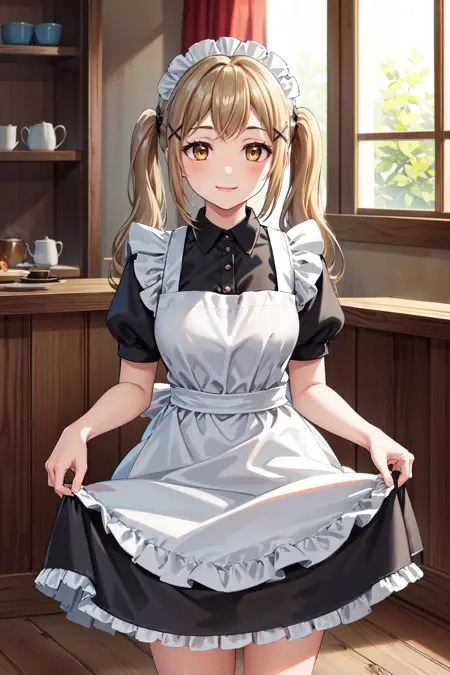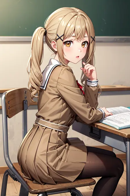 - aaarisa, 긴 머리, 트윈테일, 앞머리, x 헤어 장식, 한사키가와 학교 유니폼, 목 끈, 빨간 리본, 갈색 드레스, 흰색 선원 칼라, 갈색 셔츠, 더블 버튼, 긴 소매, 갈색 치마, 검정 스타킹, 로퍼, 갈색 신발