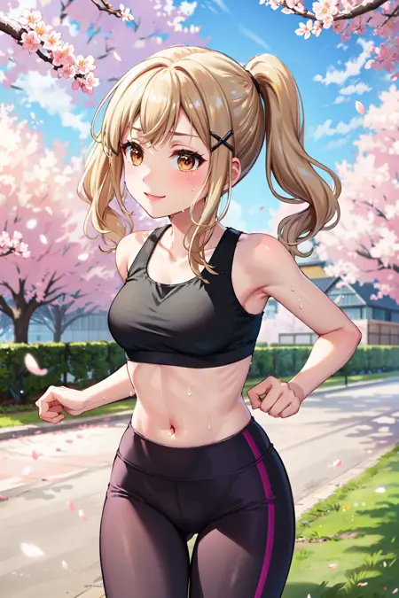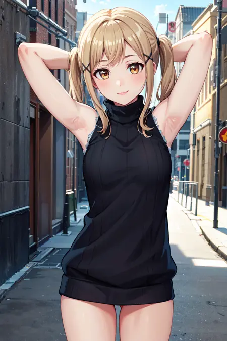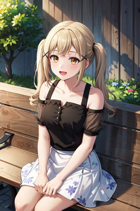 - bbarisa, 긴 머리, 트윈테일, 앞머리, x 헤어 장식, 한사키가와 학교 유니폼, 세라후쿠, 흰색 선원 칼라, 파란 넥커치프, 파란 셔츠, 짧은 소매, 흰색 치마, 검정 허벅지 스타킹, 로퍼, 갈색 신발