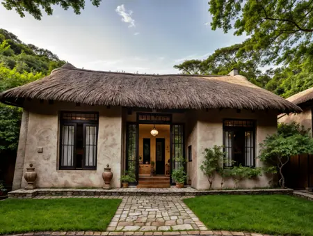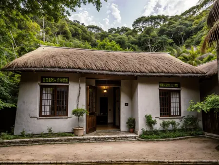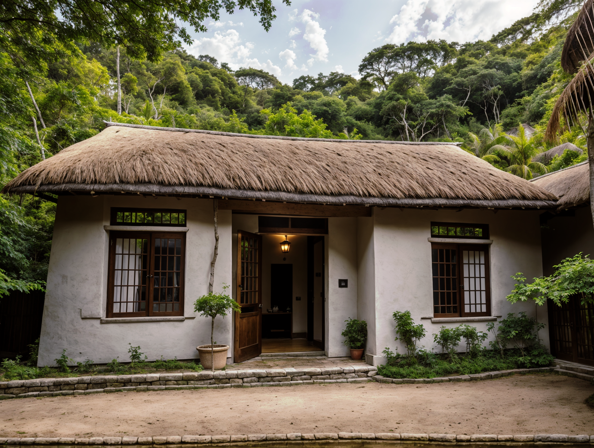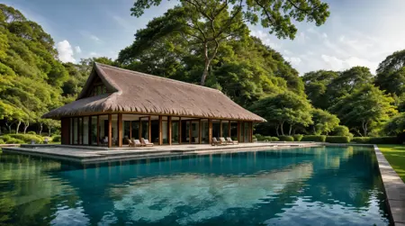 Capture an exterior portrait of a one-story suburban house featuring a distinct dark thatched roof, water-painted walls, and a mix of stone, wood, and glass elements, nestled in the center of a lush grassy campus with a serene swimming pool, surrounded by dense tropical trees, including the iconic coconut trees. Utilize Photography, employing a portrait lens on a professional-grade DSLR to highlight the unique architectural features and the tranquil natural setting