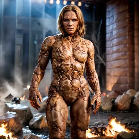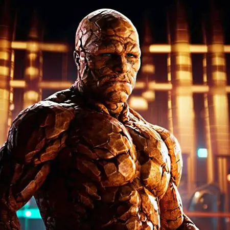 Known for his trademark rocky appearance, he has superhuman strength, a sense of humor, and the battle cry "It's clobberin' time!" Thing's speech patterns are loosely based on Jimmy Durante.[1] Michael Bailey Smith played Ben Grimm in his human form, while Carl Ciarfalio played the Thing in The Fantastic Four film from 1994, Michael Chiklis portrayed the Thing in the 2005 film Fantastic Four and its 2007 sequel Fantastic Four: Rise of the Silver Surfer. Jamie Bell acted the part in Fantastic Four (2015).
