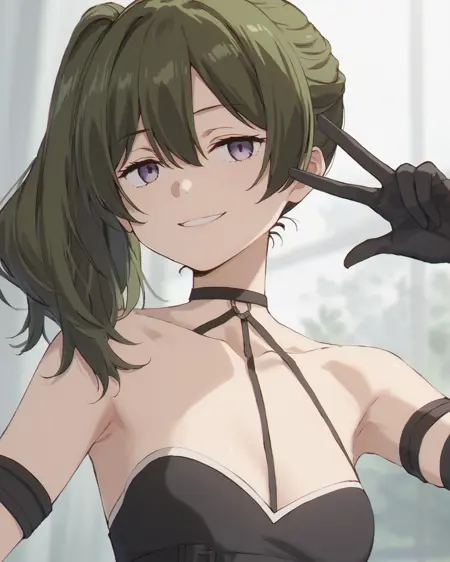 Base Prompt: ubel,1girl,green hair, bangs,hair between eyes,side ponytail, purple eyes,