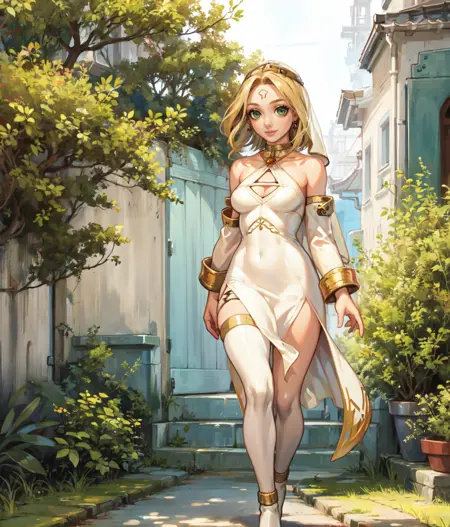 显著标签:金发、绿眼、短发、额头、侧刘海、白裙、露肩、长袖、乳沟、背纱