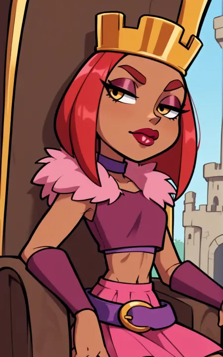衣装:紫のブーツ、ブーツ、スカート、ピンクのスカート、ベルト、紫のベルト、腹巻き、チョーカー、王冠、クロップトップ、濃いピンクのクロップトップ、腕当て、濃いピンクの腕当て、ファーのトリム、ピンクのファーのトリム**