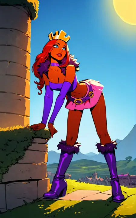 복장: 보라색 부츠, 부츠, 치마, 분홍 치마, 벨트, 보라색 벨트, 복부, 초커, 왕관, 크롭탑, 진한 분홍 크롭탑, 밴브레이스, 진한 분홍 밴브레이스, 털 장식, 분홍 털 장식**