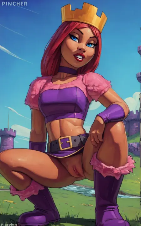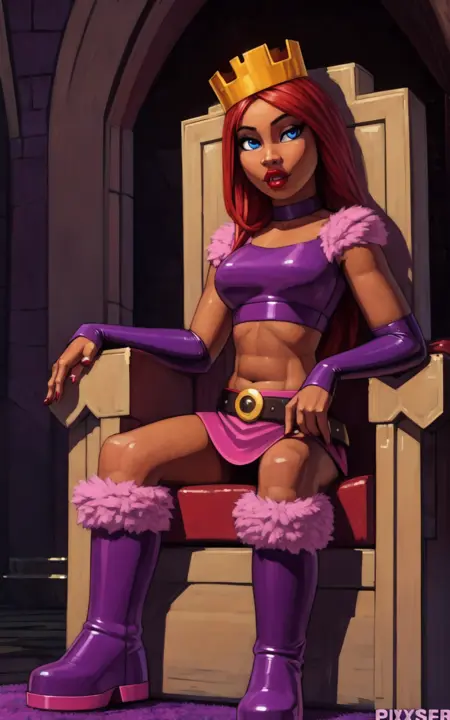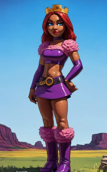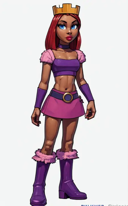 For her Outfit: purple boots, boots, skirt, pink skirt, belt, purple belt, midriff, choker, crown, crop top, dark pink crop top, vambraces, dark pink vambraces, fur trim, pink fur trim**