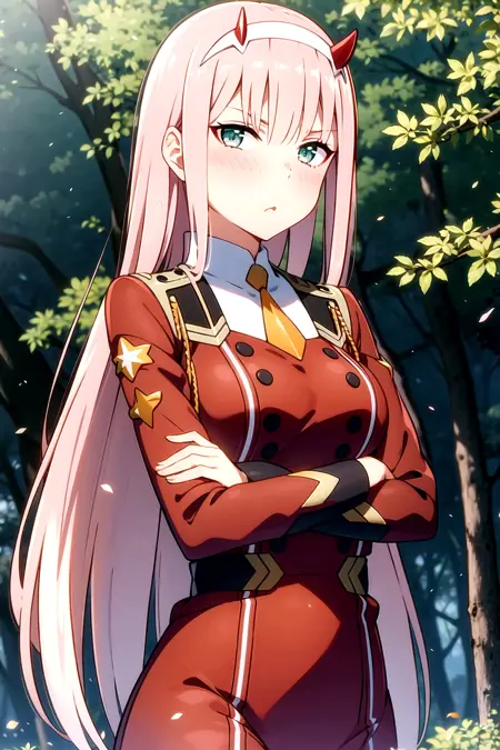 Tags for her original outfit: 1girl, solo, long hair, smile, long sleeves, dress, medium breasts, very long hair, green eyes, pink hair, pantyhose, hairband, necktie, horns, uniform, aqua eyes, black pantyhose, military, military uniform, red dress, straight hair, white hairband, short necktie, orange necktie