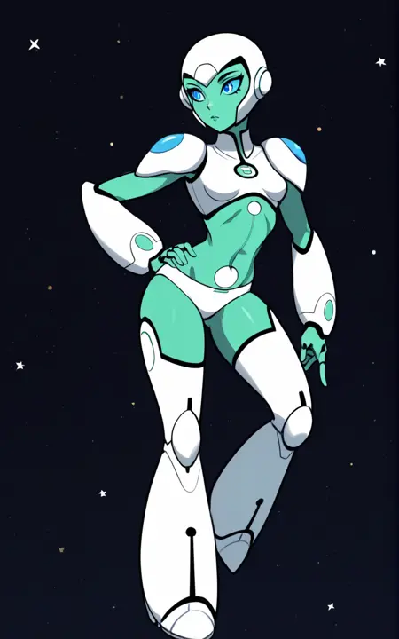 강화 태그: 가슴판, 어깨 패드, 갑옷, 발가락 없음, 허벅지 양말, 흰 허벅지 양말, 팬티, 흰 팬티, 녹색 피부, 파란 눈, 헬멧, 흰 헬멧, 로봇, 안드로이드, 로봇 관절**