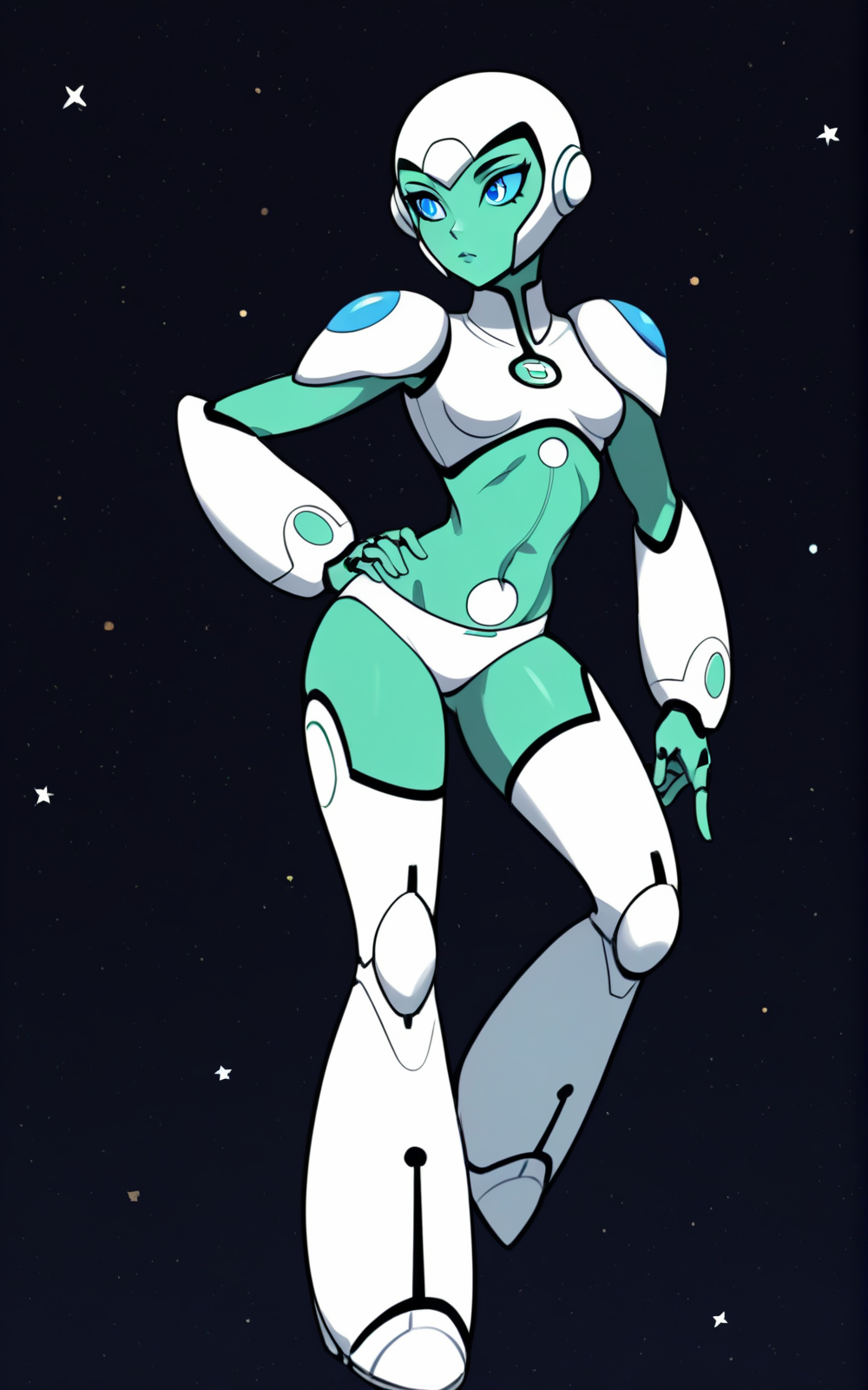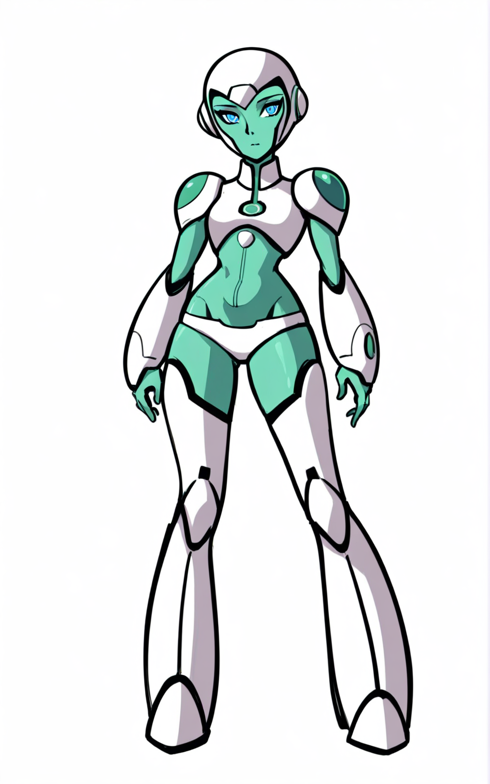Reinforcement Tags: breastplate, shoulder pads, armor, featureless feet, thighhighs, white thighhighs, panties, white panties, green skin, blue eyes, helmet, white helmet, robot, android, robot joints**