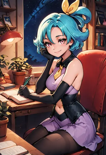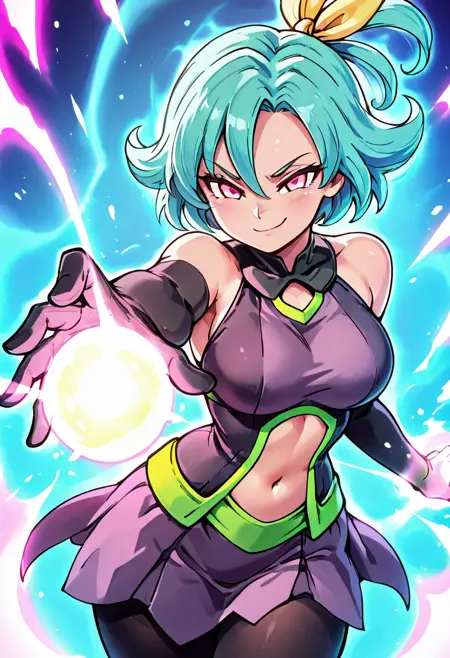 zzMio, pink eyes, aqua hair, hair between eyes, hair ribbon, short hair, yellow ribbon, bare shoulders, black elbow gloves, purple dress, navel cutout, pantyhose,