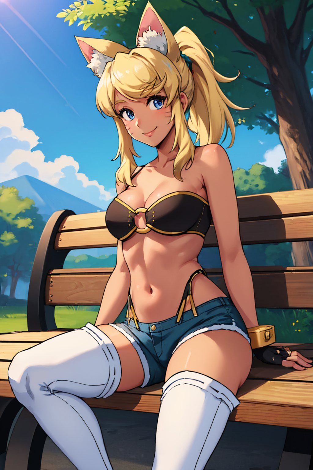 Default Outfit: o-ring top, beltbra, fingerless gloves, denim shorts, white thighhighs