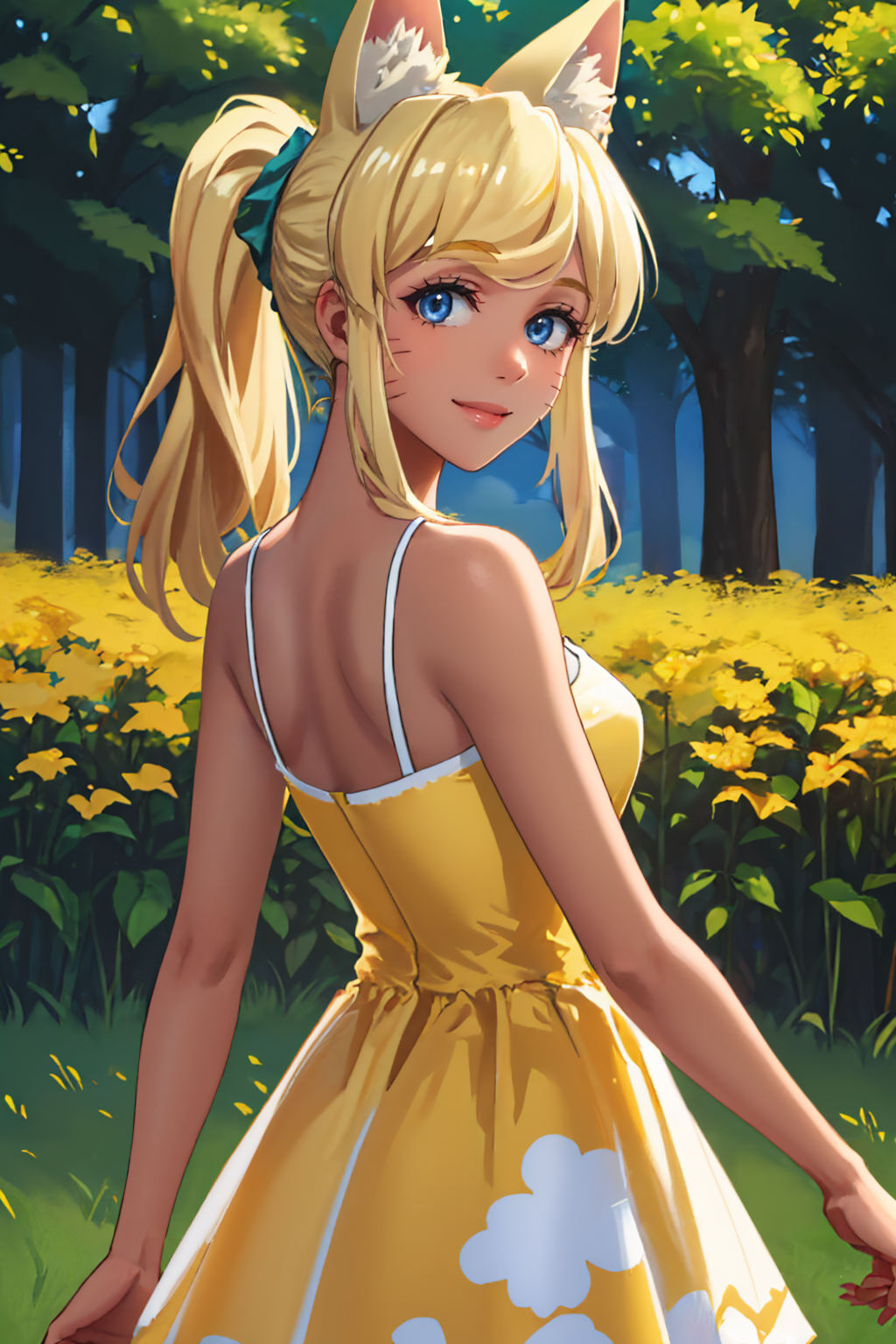 Trigger + Appearance: pokanliru, dark skin, whisker markings, ponytail, wolf tail