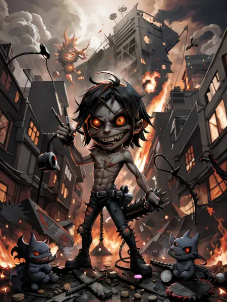 This Lora contains 6 popular mascots but the goal is to create a style that allows you to create your own macabre mascot. You can use their names and try to create something like the originals, but why not get creative?