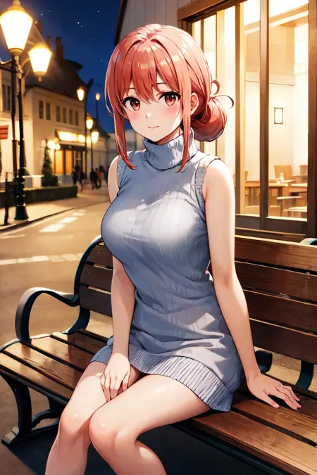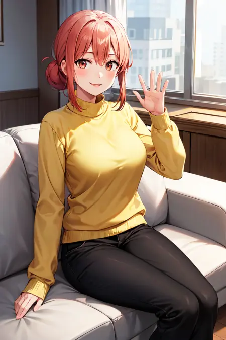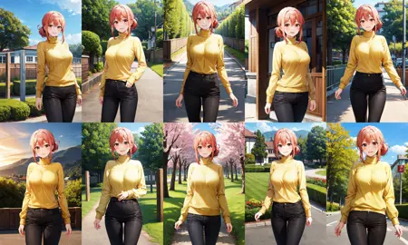 outfit1gahamama, single hair bun, breasts, turtleneck, yellow sweater, long sleeves, black pants