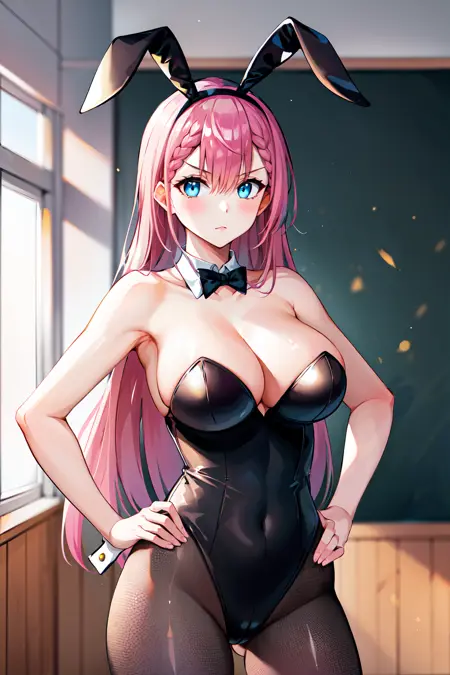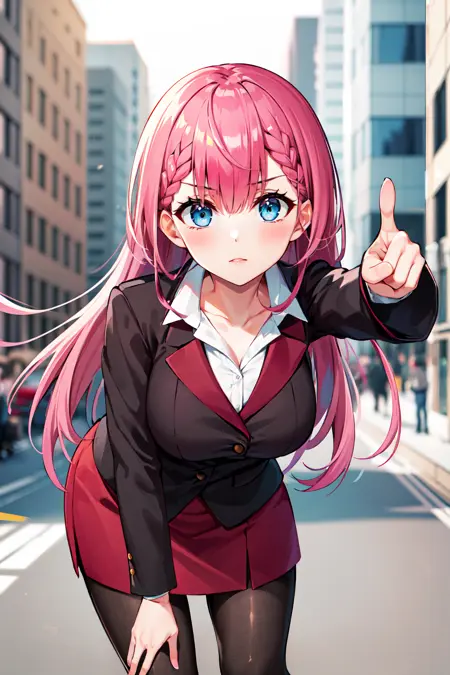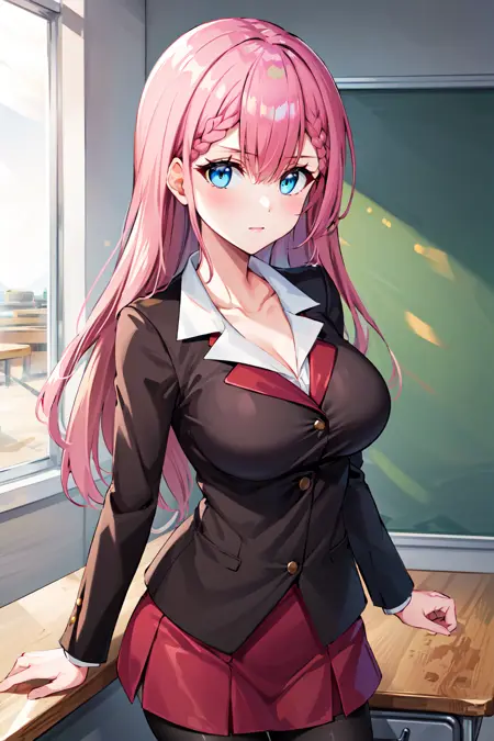 mafuyu1, 1girl, solo, long hair, pink hair, blue eyes, red skirt, jacket, hair between eyes, braid, skirt suit, long sleeves, black pantyhose, white shirt, brown pantyhose, collarbone, large breasts