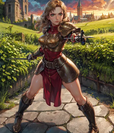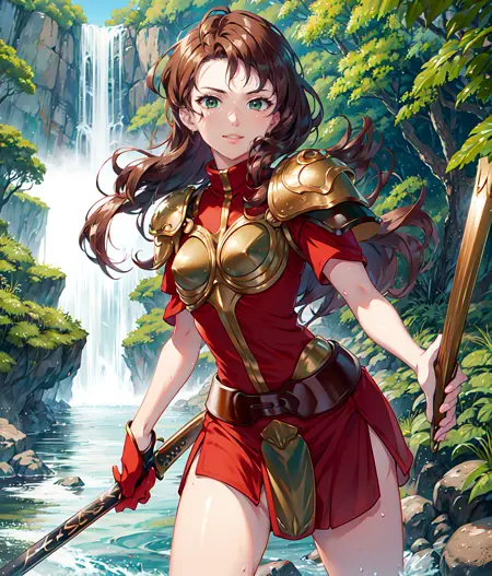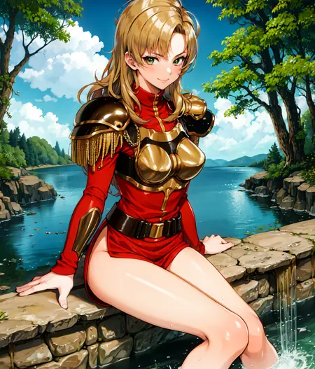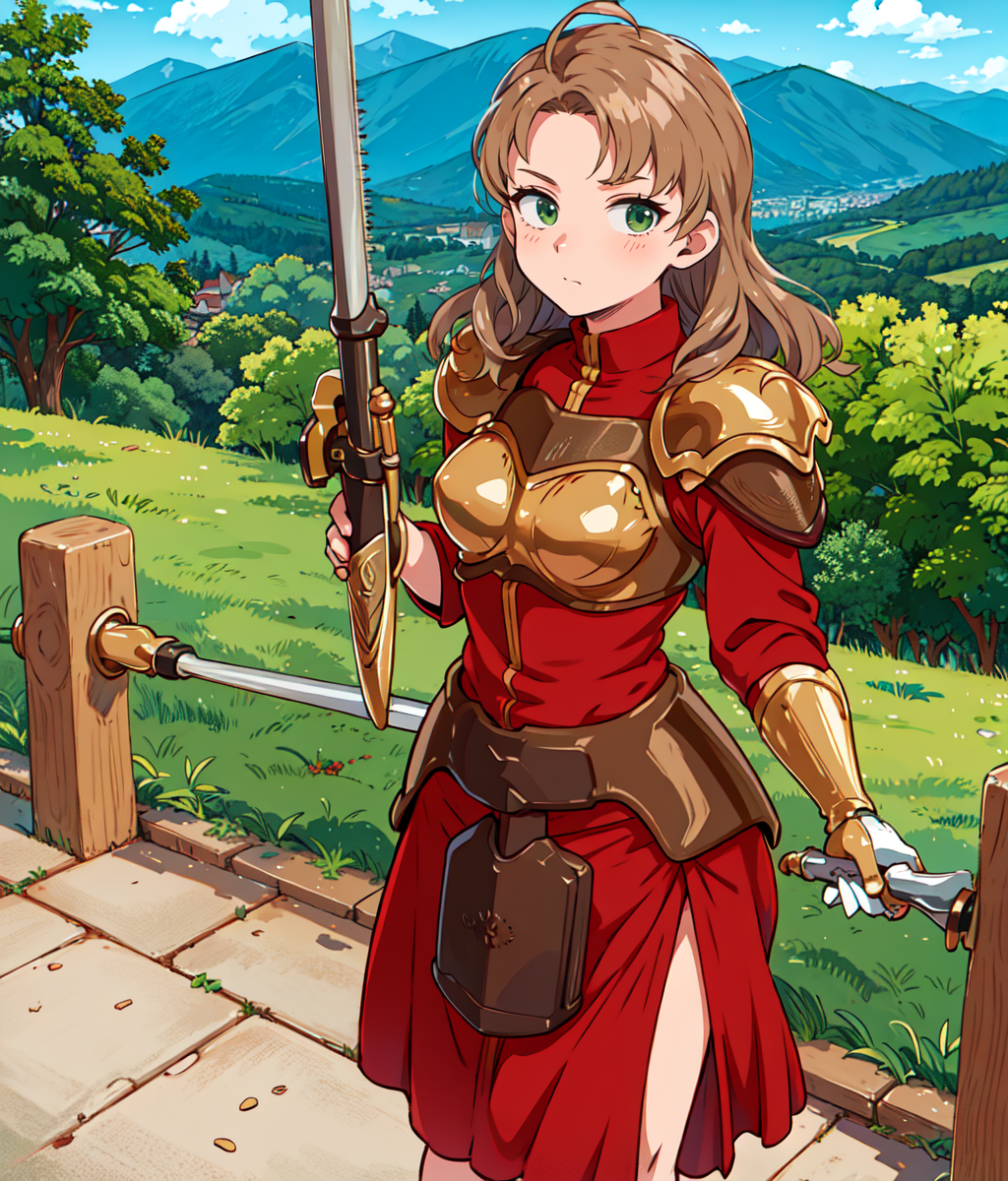 Notable tag: long hair, dark blonde, green eyes, hair at one side, red outfit, bronze armor
