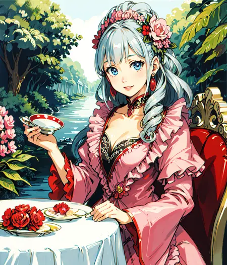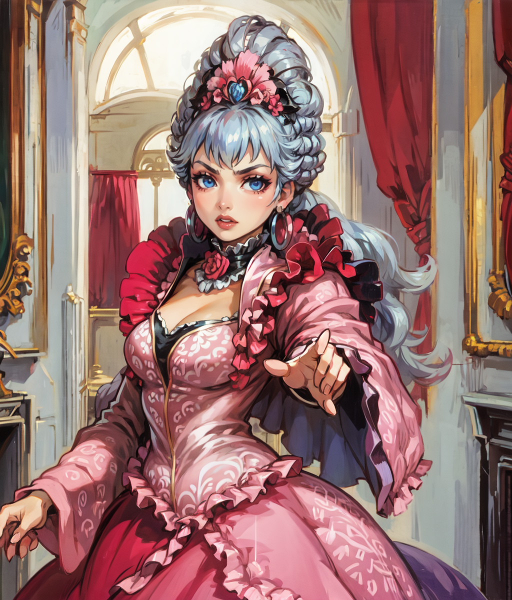 Notable tags: curls, blue eyes, pouf, hair up, hair ornament, plumes, pink dress,