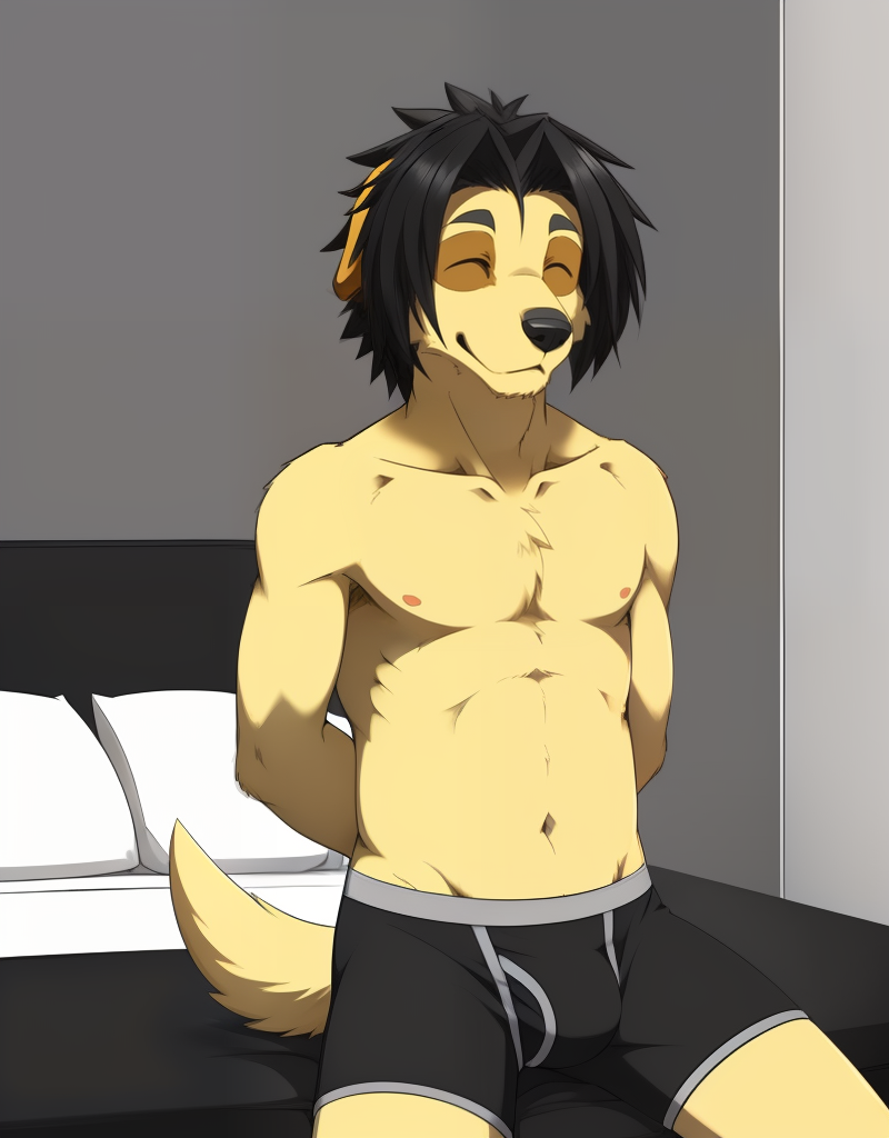 関連ワード:黄色い肌、色付き肌、体毛、短髪、黒髪、髪の毛の流れ、目を閉じている、犬の尾、犬男、犬の耳、動物の耳、動物の鼻、吻、制服、靴、スニーカー、黒色男性下着、水着、青色ショートパンツ