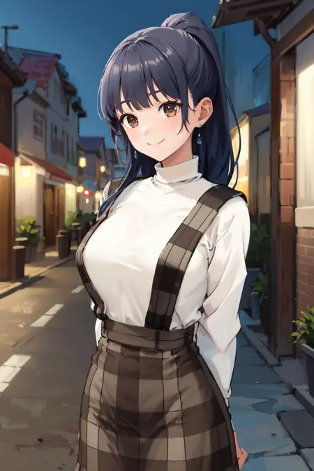 - bbanna,long hair,ponytail,bangs,earrings,large breasts,white sweater,turtleneck,suspender skirt,plaid skirt