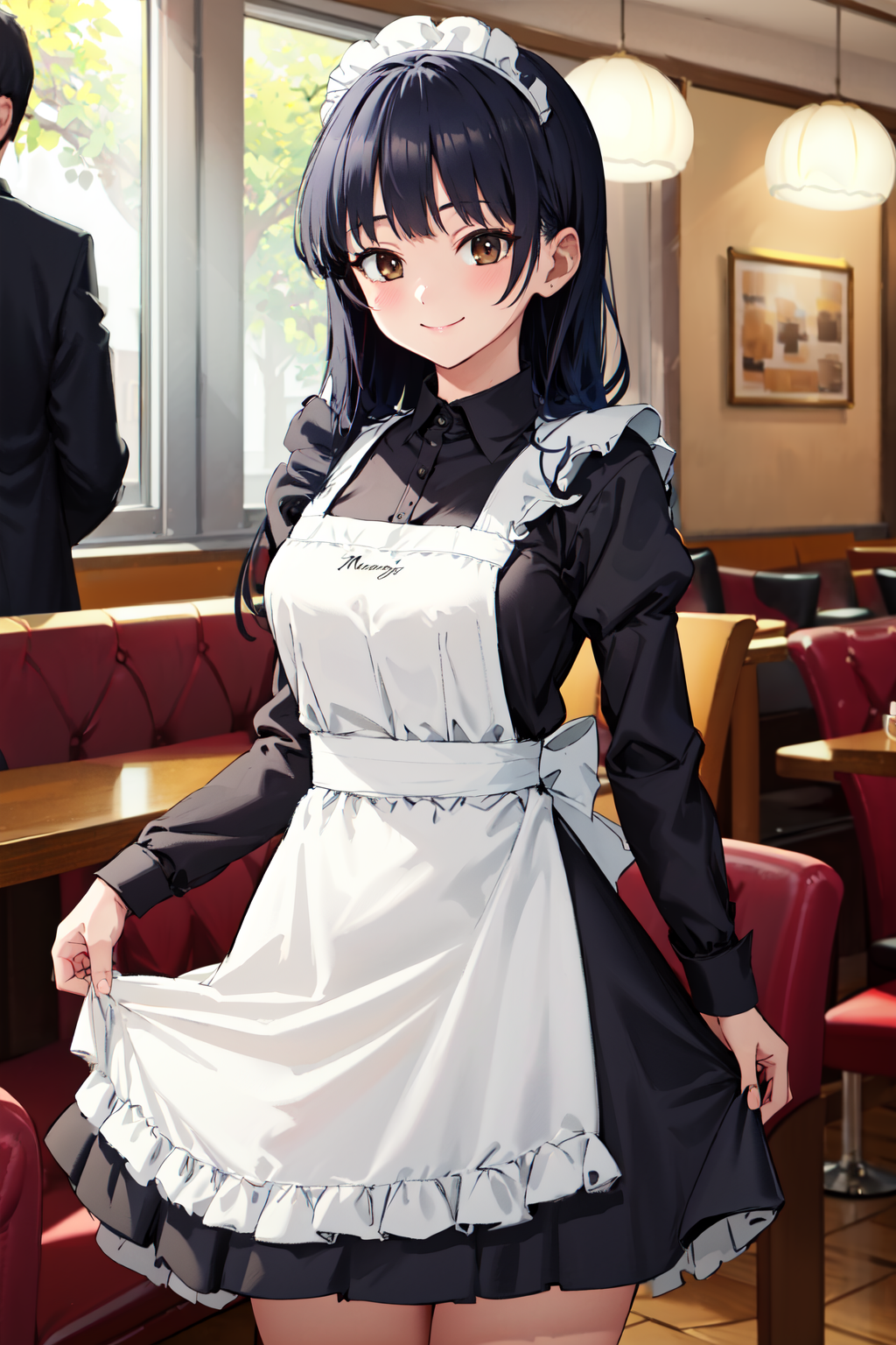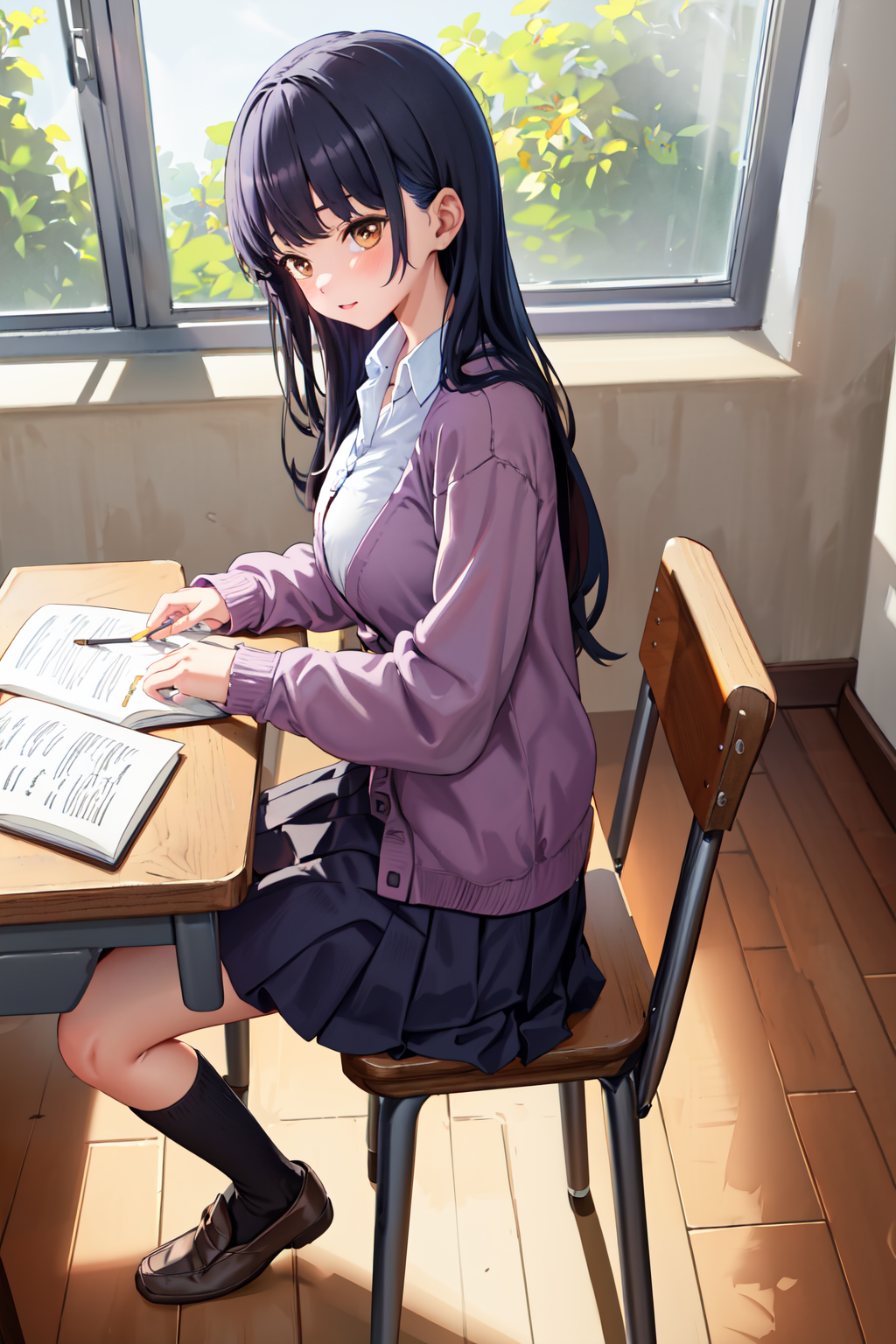 - aaanna,long hair,bangs,large breasts,school uniform,jacket,blue jacket,blazer,open clothes,cardigan,purple cardigan,shirt,white shirt,sleeves past wrists,blue skirt,(black socks:1.2),loafers,brown footwear