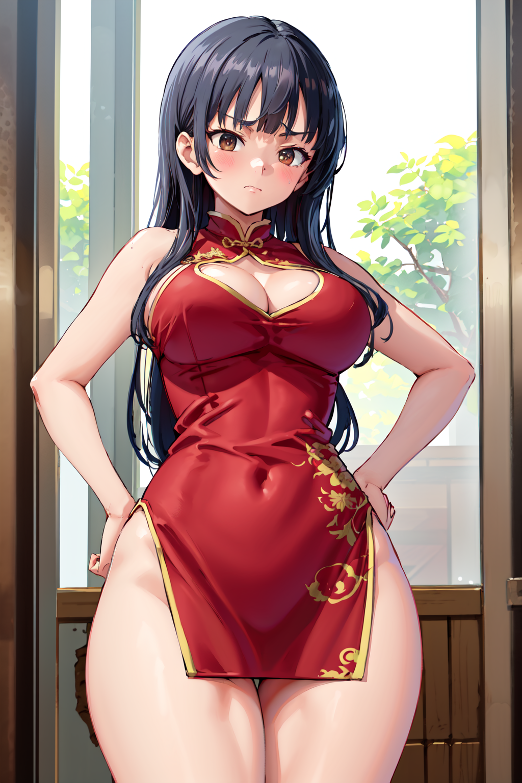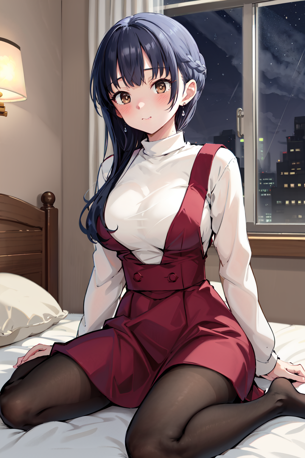 - ccanna,long hair,braid,bangs,earrings,large breasts,coat,brown coat,red dress,white shirt,turtleneck,skirt,pantyhose,black pantyhose