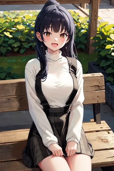 • bbanna, 긴 머리, 토끼 꼬리, 앞머리, 귀걸이, 큰 가슴, 흰 스웨터, 터틀넥, 매달린 치마, 체크무늬 치마