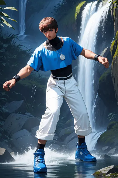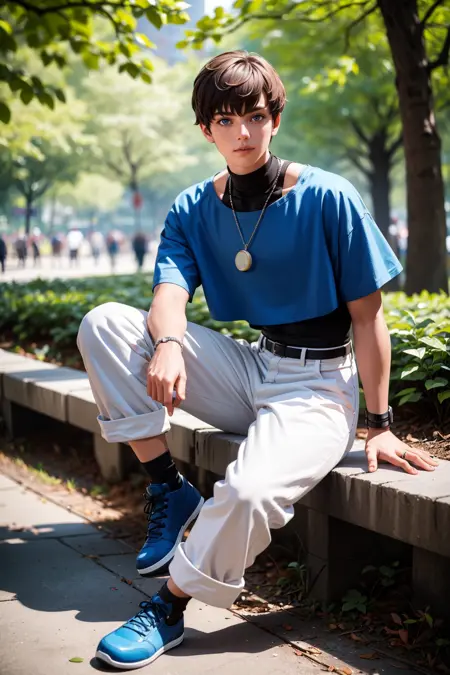그의 옷을 수정하려면 파란 크롭탑, 검정 터틀넥 티셔츠, 메달리온, 흰 바지, 검정 양말, 파란 부츠와 같은 단어를 사용하세요.