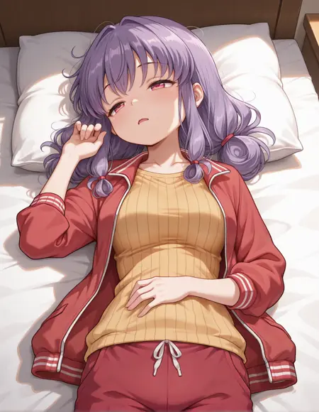 외모: 보라색 머리, 낮게 접힌 듀얼 테일, 분홍색 눈