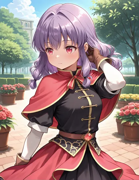 마법사 복장: mgrcinamimitsuru, inmmgc, 검은 머리핀, 빨간 커피라, 검은 블라우스, 보석이 달린 갈색 벨트, 긴 소매 위에 짧은 소매, 흰색 소매, 갈색 장갑, 검은 중간 길이 스커트, 빨간 겉스커트, 흰색 바지, 갈색 무릎 부츠