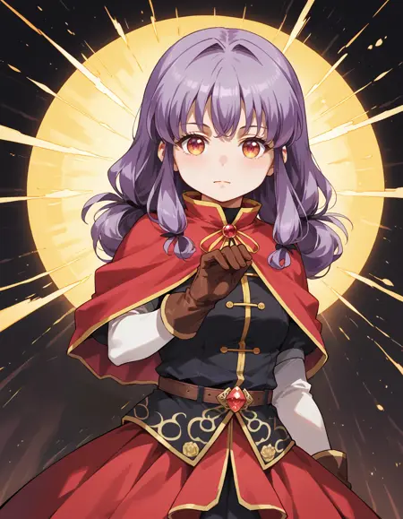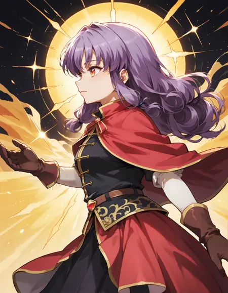 Magical outfit: mgrcinamimitsuru, inmmgc, black hairpins, red capelet, black blouse, brown belt with gem, short over long sleeves, white sleeves, brown gloves, black medium skirt, red overskirt, white pants, brown knee boots