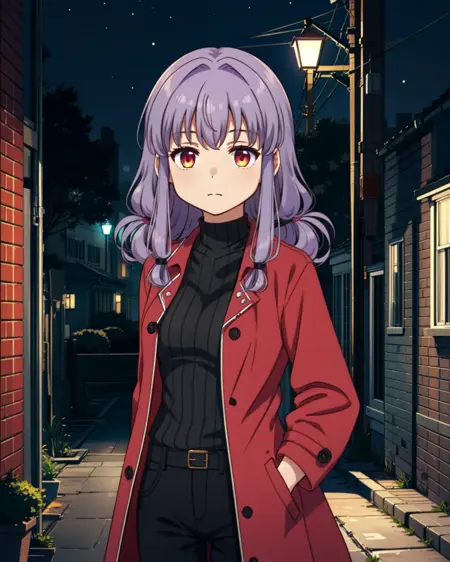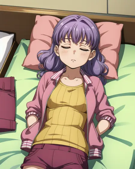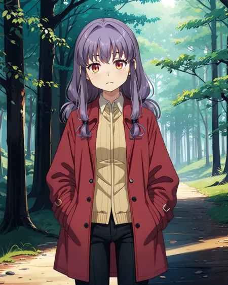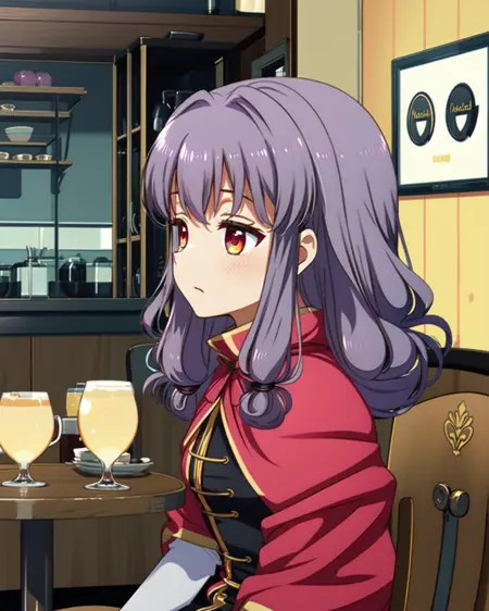 Appearance: purple hair, folded low twintails, pink eyes