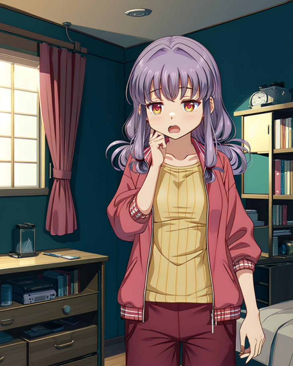 Casual outfit: mgrcinamimitsuru, inmcsl, red hairpins, yellow ribbed t-shirt, red track jacket, red shorts