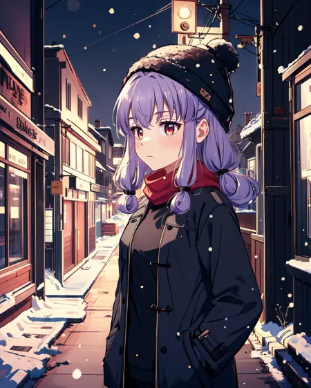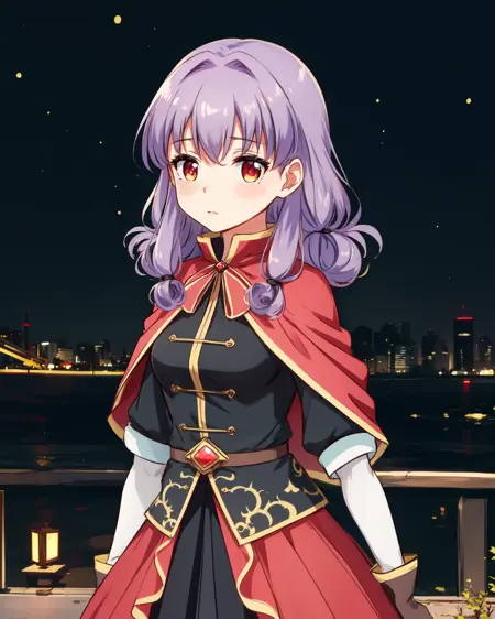 Appearance: purple hair, folded low twintails, pink eyes