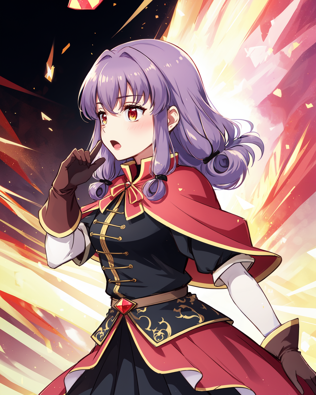 Magical outfit: mgrcinamimitsuru, inmmgc, black hairpins, red capelet, black blouse, brown belt with gem, short over long sleeves, white sleeves, brown gloves, black medium skirt, red overskirt, white pants, brown knee boots