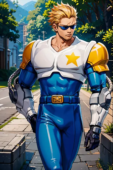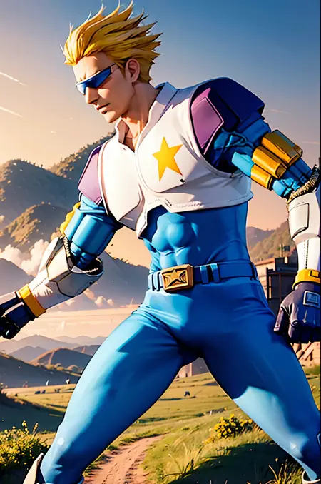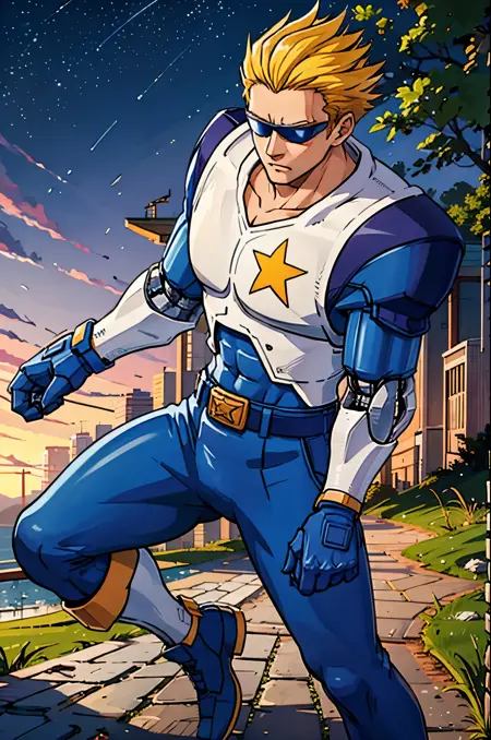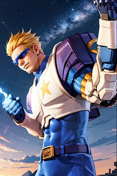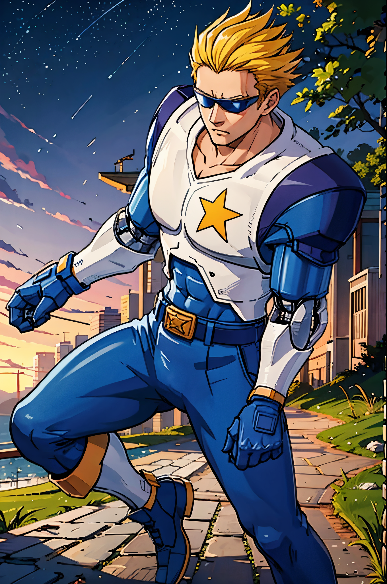 captain, armor, spiked hair, short hair, mechanical arms, power lines, blue gloves, gauntlets, 1boy, male focus, blonde hair, sunglasses, closed mouth, star \(symbol\), boots, belt, pants, star print, blue pants, gloves