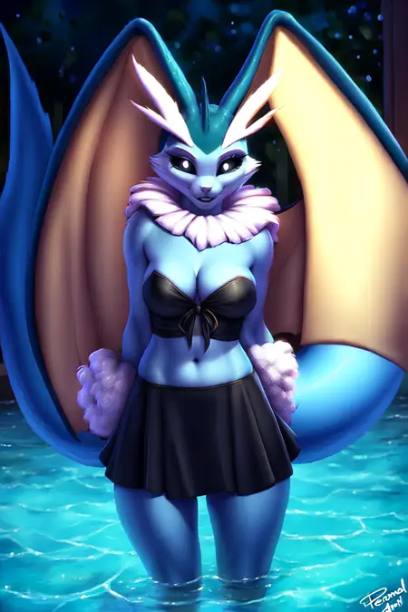 This LoRA generates the vaporeon/lopunny fusion know as Vaporunny. Both fusions, vaporeon_ears and lopunny_ears, are packed into this LoRA. Works at 0.7 to 1 scale, but will vary per model.