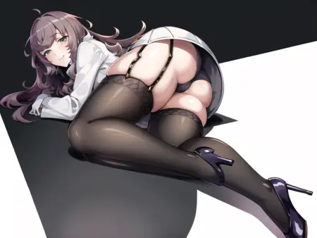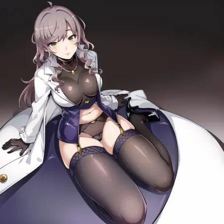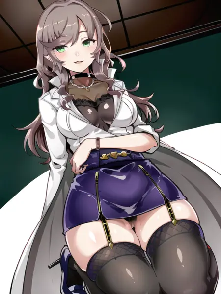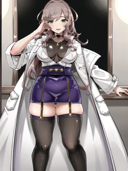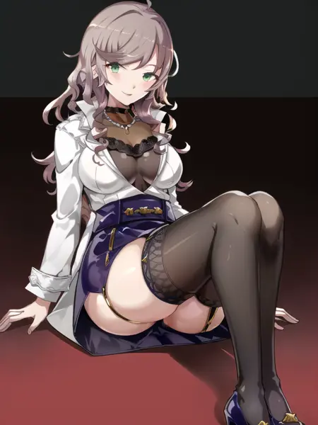asuka_hina_adult,brown hair, wavy hair, long hair,green eyes, white coat,black shirt,black gloves,miniskirt, garter straps, stocking,high heels,