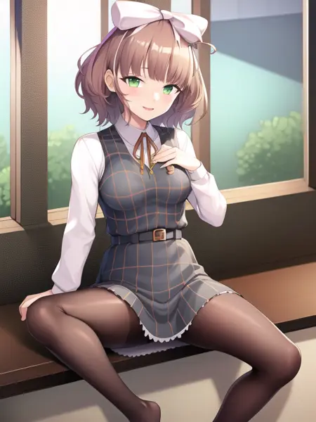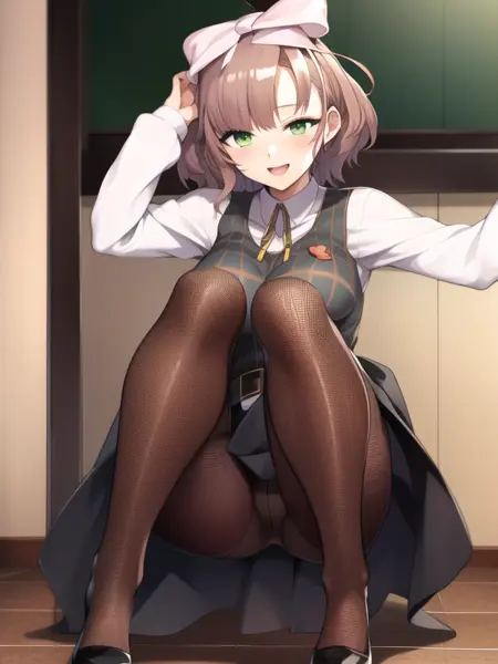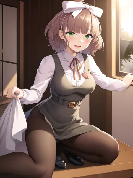 asuka_hina,brown hair, short hair, bob cut, hair ribbon, green eyes, dress,white shirt, school uniform,pantyhose,loafers,