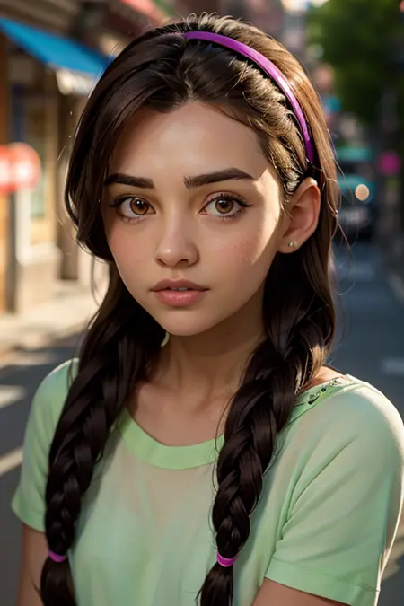prompt: An impressive and intricate full color portrait, Ultra-HD a 13 year old girl, brown hair with 2 braids, brown eyes, pink headband, detailed face, dressed in a light green t-shirt with embroidery on the neck, no logos, epic character composition, alessio albi, nina masic, sharp focus, natural lighting, subsurface dispersion, f2, 35mm,,