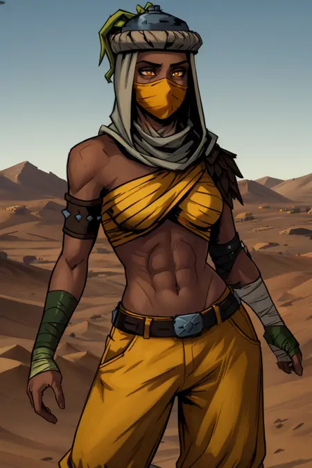 yellow top, yellow harem pants, arm bandages, navel, ---- helmet,