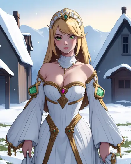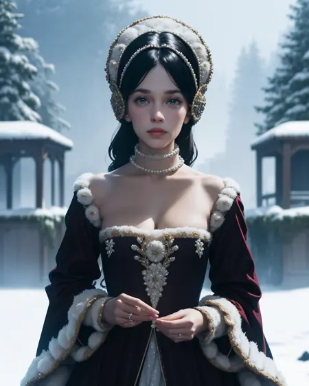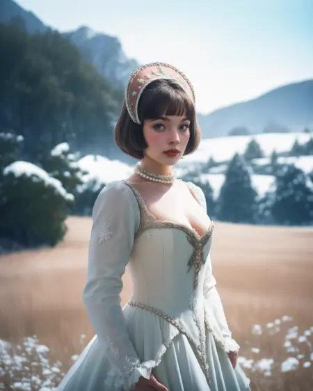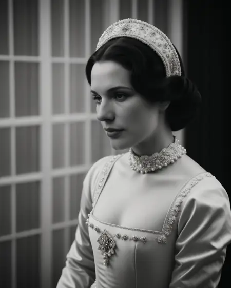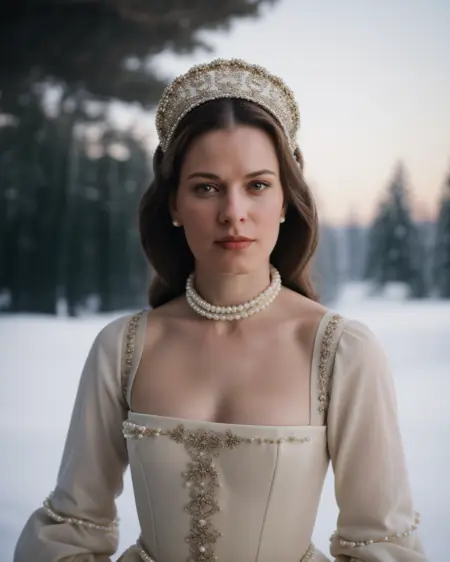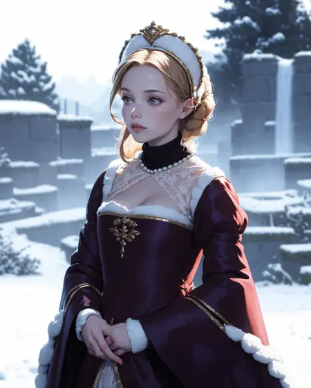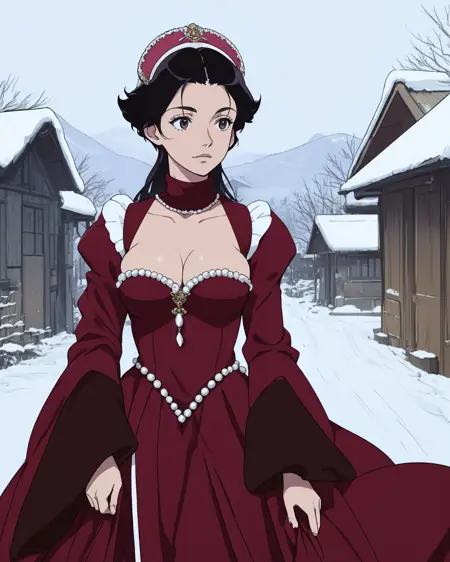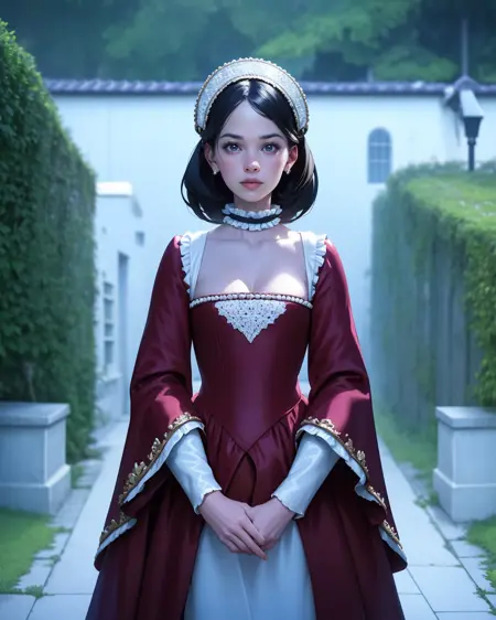 So, I merged some probably maybe not sure mostly not accurate "recreation" photos with wildly not accurate photos into a training set, made them shake hands, and created this. I focused almost exclusively on ones with the arc headpiece, as I didn't want to confuse SD with the weirder tricornish or square ones. The stiff-front corset is better the more real you go, anime has their own take on those things.
