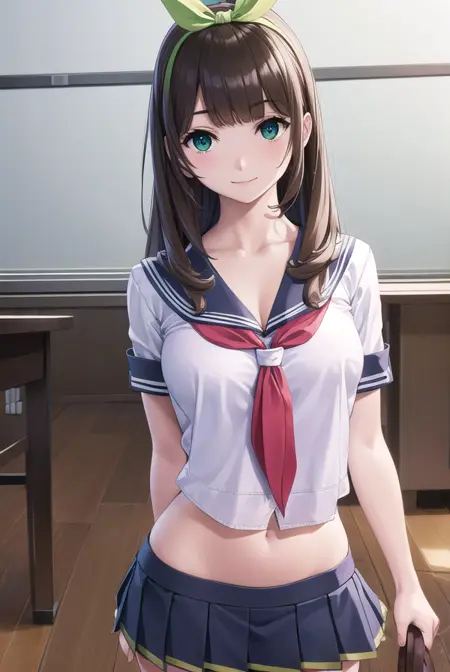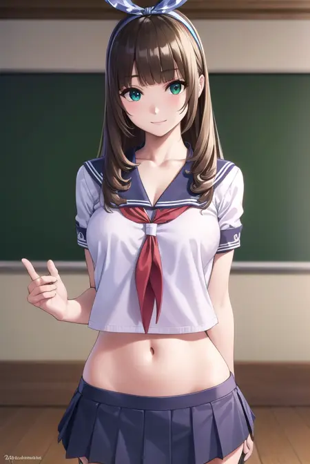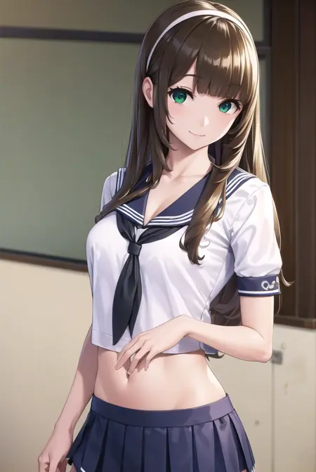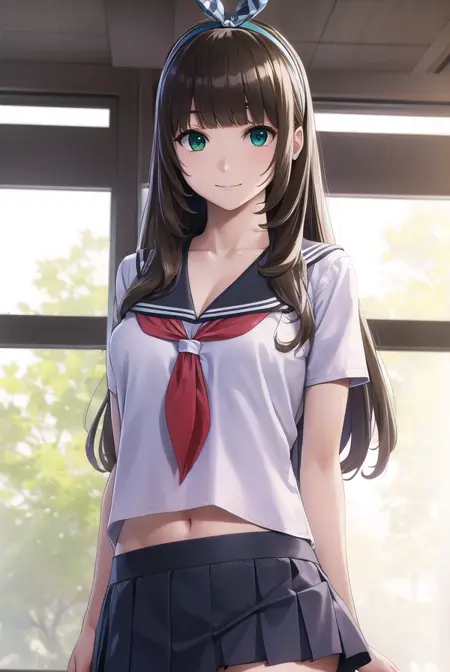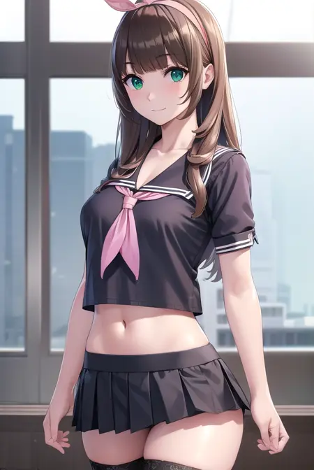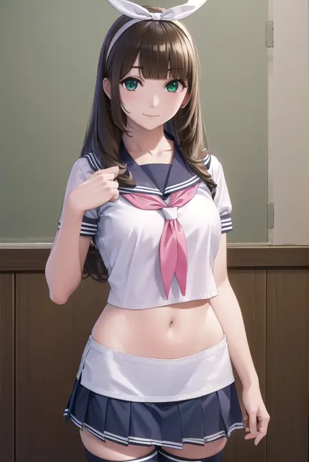 치마, 허벅지까지 긴 양말, 배꼽, 가슴선, 교복, 접힌 치마, 헤어밴드, 신발, 세라후쿠, 검은 허벅지까지 긴 양말, 검은 치마, 젯사이 루오기, 넥카치, 리본, 헤어 리본, 셔츠, (분홍 셔츠:1.2), (빨간 넥카치:1.2),