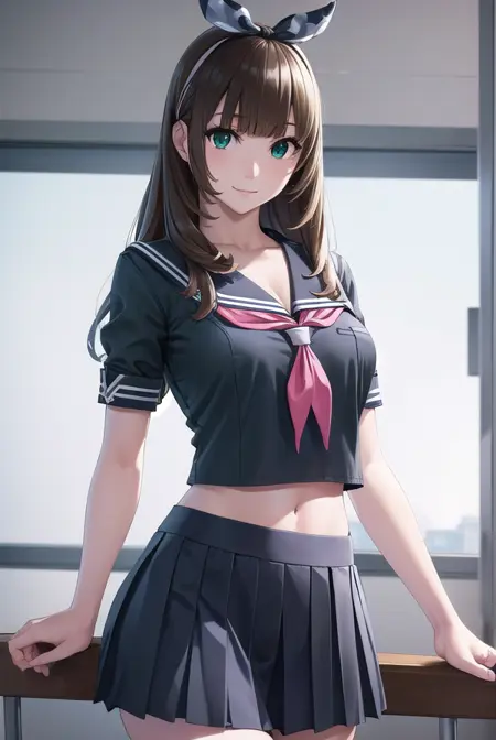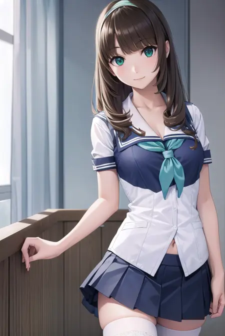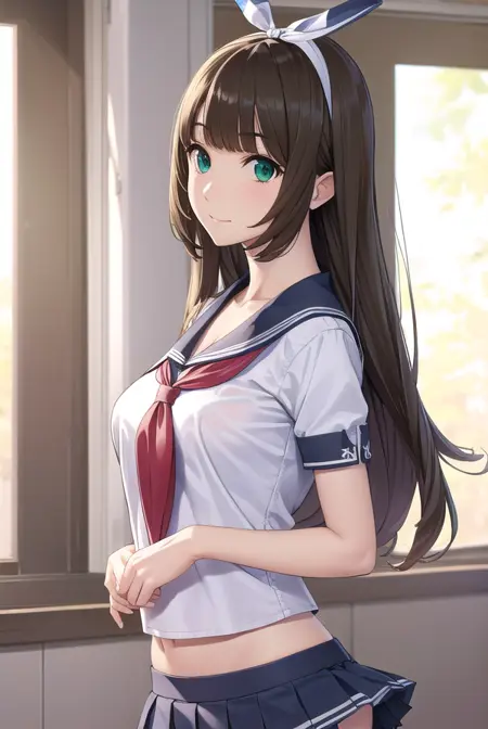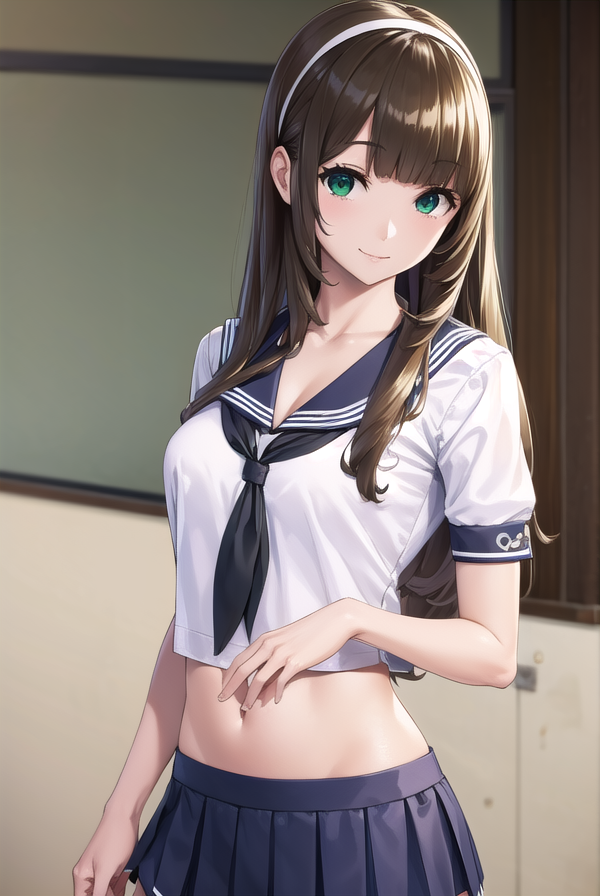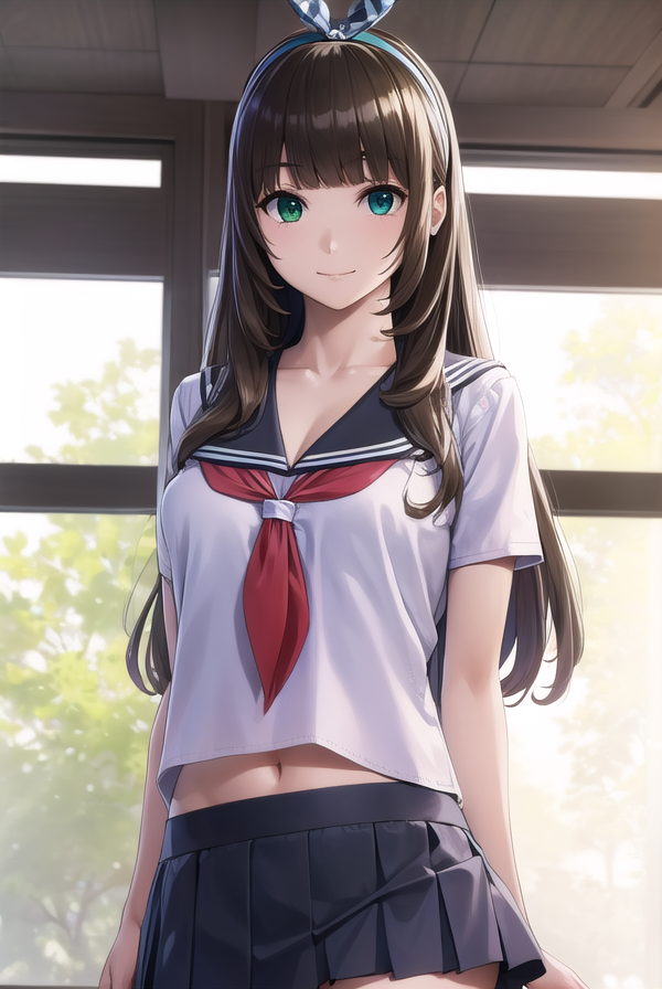 chitose nishina, long hair, brown hair, (green eyes:1.3), bangs, blunt bangs,