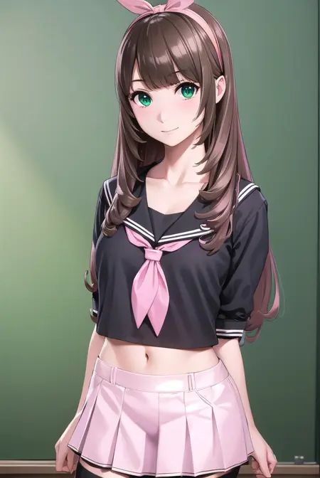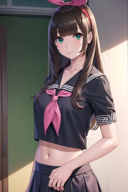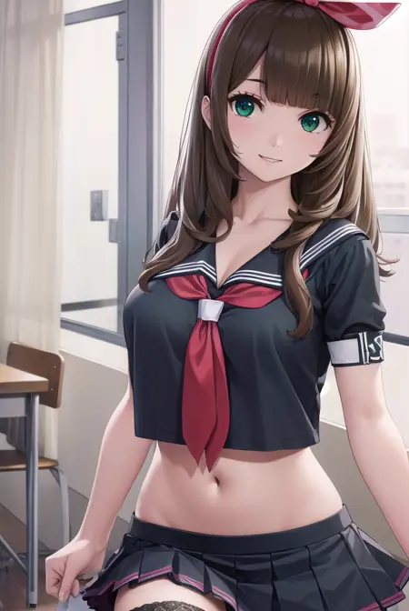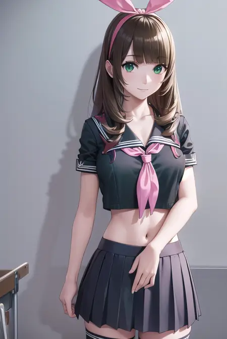 skirt, thighhighs, navel, cleavage, school uniform, pleated skirt, hairband, shoes, serafuku, black thighhighs, black skirt, zettai ryouiki, neckerchief, bow, hair bow, shirt, (pink shirt:1.2), (red neckerchief:1.2),