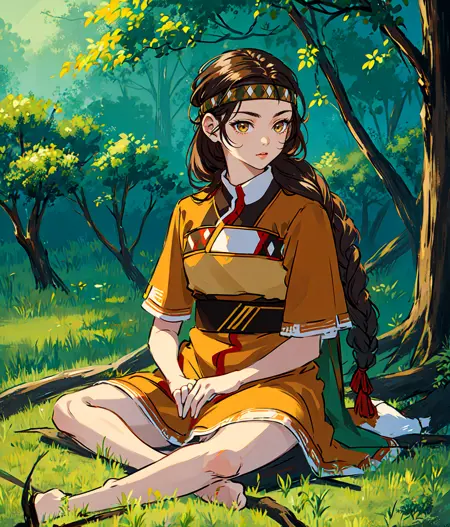 Notable tags; brown hair, brown eyes, single back braid, headband, yellow native american costume