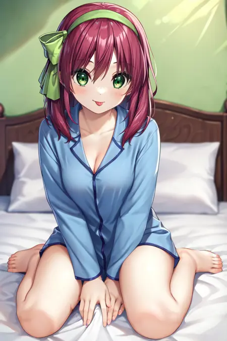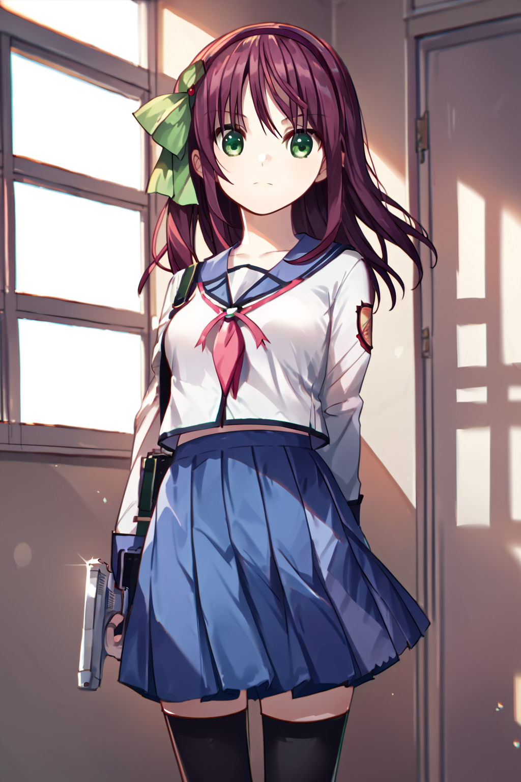 Prompts you want for her outfit: white school uniform, lavender skirt, black stockings, white beret with green ribbon/green ribbon in hair